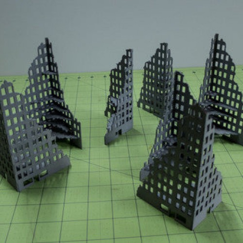 A collection of 7 tall ruined buildings for your city Perfect for 6mm wargames and Sci-Fi games like Robotech RPG Tactics. These are all corner pieces consisting of two walls.