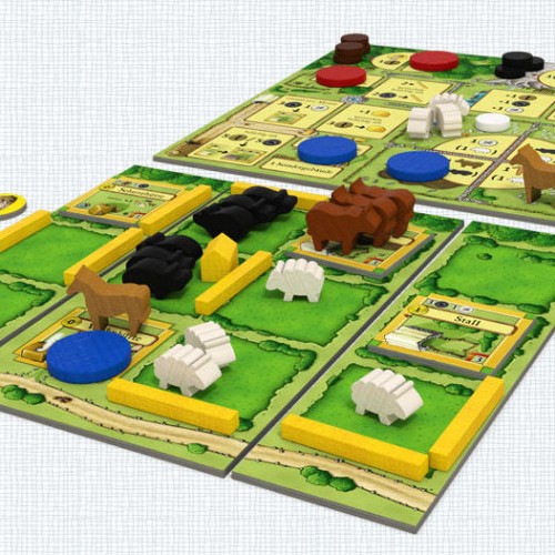 Agricola: All Creatures Big and Small is a new take on Uwe Rosenberg’s Agricola designed for exactly two players and focused only on the animal husbandry aspect of that game. So long plows and veggies! In Agricola: All Creatures Big and Small, you become an animal breeder of horses, cows, sheep and pigs and try to make the most of your pastures. Players start with a 3×2 game board that can be expanded during play to give more room for players to grow and animals to run free. Sixteen possible actions are available for players to take, with each player taking three actions total in each of the eight rounds. The player who amasses the most victory points through enclosing space with fences and acquiring the largest number and variety of animals and victory point-generating buildings will be the winner. These buildings each provide unique special abilities during play and/or VP at game end. Balancing the tension between building infrastructure (fenced pastures and buildings) and acquiring animals (the single biggest source of end-game scoring) is the key to success!