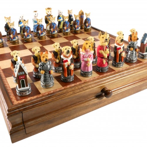Chess Set – Cats & Dogs Resin Chessmen on Walnut Maple Chest (ONLINE ORDER ONLY)