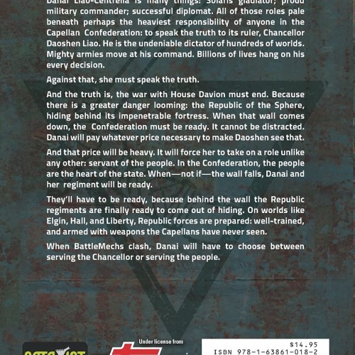 Danai Liao-Centrella is many things: Solaris gladiator; proud military commander; successful diplomat. All of those roles pale beneath perhaps the heaviest responsibility of anyone in the Capellan Confederation: to speak the truth to its ruler, Chancellor Daoshen Liao. He is the undeniable dictator of hundreds of worlds. Mighty armies move at his command. Billions of lives hang on his every decision.