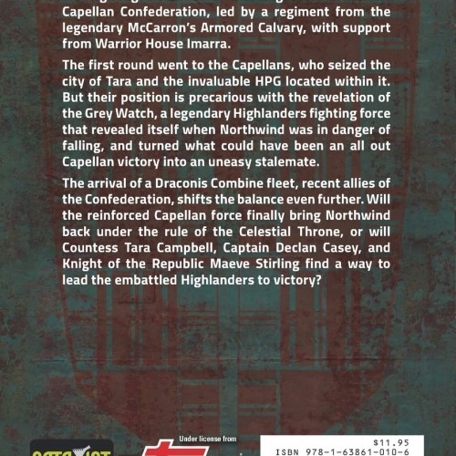 NO PRICE TOO HIGH…On the besieged planet of Northwind, the Highlanders are fighting a tenacious invading force from the Capellan Confederation, led by a regiment from the legendary McCarron’s Armored Calvary, with support from Warrior House Imarra. The first round went to the Capellans, who seized the city of Tara and the invaluable HPG located within it. But their position is precarious with the revelation of the Grey Watch, a legendary Highlanders fighting force that revealed itself when Northwind was in danger of falling, and turned what could have been an all out Capellan victory into an uneasy stalemate. The arrival of a Draconis Combine fleet, recent allies of the Confederation, shifts the balance even further. Will the reinforced Capellan force finally bring Northwind back under the rule of the Celestial Throne, or will Countess Tara Campbell, Captain Declan Casey, and Knight of the Republic Maeve Stirling find a way to lead the embattled Highlanders to victory?