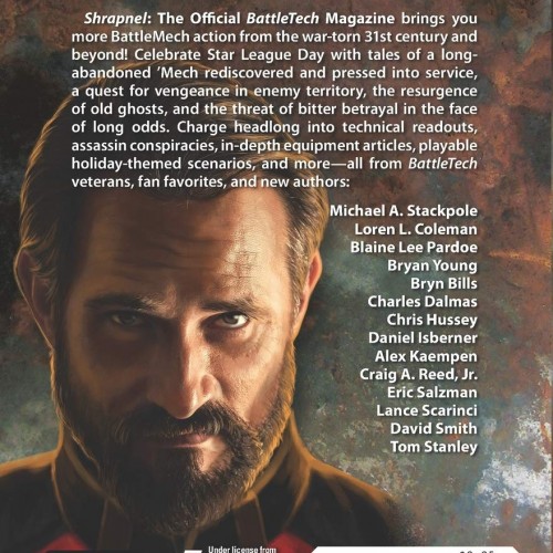 THE DAY THE STAR LEAGUE DIED! Shrapnel: The Official BattleTech Magazine brings you more BattleMech action from the war-torn 31st century and beyond! Celebrate Star League Day with tales of a long-abandoned ’Mech rediscovered and pressed into service, a quest for vengeance in enemy territory, the resurgence of old ghosts, and the threat of bitter betrayal in the face of long odds. Charge headlong into technical readouts, assassin conspiracies, in-depth equipment articles, playable holiday-themed scenarios, and more—all from BattleTech veterans, fan favorites, and new authors: Michael A. Stackpole, Loren L. Coleman, Blaine Lee Pardoe, Bryan Young, Bryn Bills, Charles Dalmas, Chris Hussey, Daniel Isberner, Alex Kaempen, Craig A. Reed, Jr., Eric Salzman, Lance Scarinci, David Smith, Tom Stanley