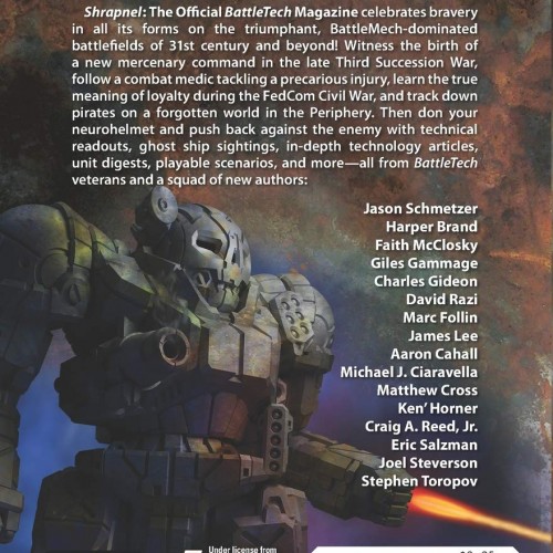 Shrapnel: The Official BattleTech Magazine celebrates bravery in all its forms on the triumphant, BattleMech-dominated battlefields of 31st century and beyond! Witness the birth of a new mercenary command in the late Third Succession War, follow a combat medic tackling a precarious injury, learn the true meaning of loyalty during the FedCom Civil War, and track down pirates on a forgotten world in the Periphery. Then don your neurohelmet and push back against the enemy with technical readouts, ghost ship sightings, in-depth technology articles, unit digests, playable scenarios, and more—all from BattleTech veterans and a squad of new authors: