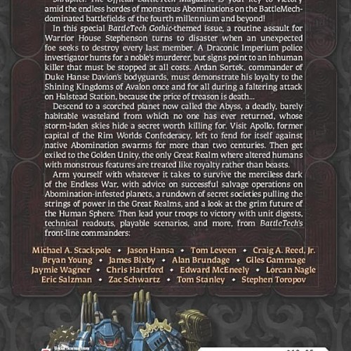 In this special BattleTech Gothic-themed issue, a routine assault for Warrior House Stephenson turns to disaster when an unexpected foe seeks to destroy every last member. A Draconic Imperium police investigator hunts for a noble’s murderer, but signs point to an inhuman killer that must be stopped at all costs. Ardan Sortek, commander of Duke Hanse Davion’s bodyguards, must demonstrate his loyalty to the Shining Kingdoms of Avalon once and for all during a faltering attack on Halstead Station, because the price of treason is death…