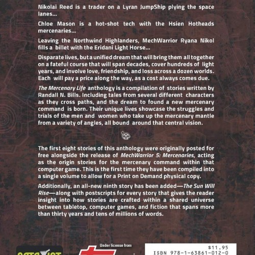 The Mercenary Life anthology is a compilation of stories written by Randall N. Bills. Including tales from several different characters as they cross paths, and the dream to found a new mercenary command is born. Their unique lives showcase the struggles and trials of the men and women who take up the mercenary mantle from a variety of angles, all bound around that central vision.