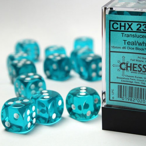 Chessex Translucent Teal/White 16MM D6 Dice Block (12 dice)