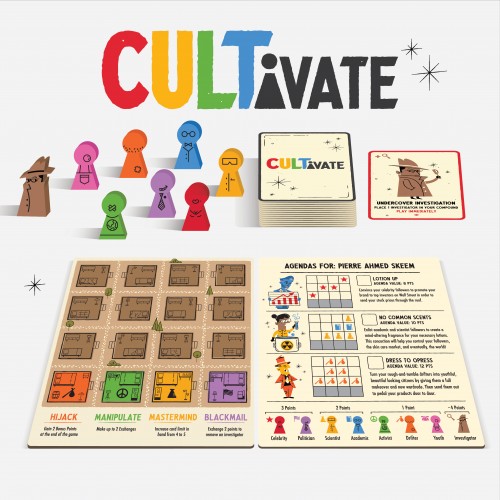 In the game CULTivate, you work to collect follower meeples needed to match the pattern of your character’s agenda. Play cards from your hand allowing you to gain followers, manage follower placement within your compound, and sabotage rival cult leaders. As you draw cards, Undercover Investigations can pop up and add investigators to your compound stopping you from recruiting followers. Not gaining the type of followers you want? Make exchanges with follower meeples in the supply to help you complete your agenda and fill your compound. As you recruit followers you will activate powers making it easier for you to fill your compound. When a player fills their compound, the end of the game is triggered. Players tally the points of their followers, points from completed agendas, and any earned bonuses to see who comes out on top.
