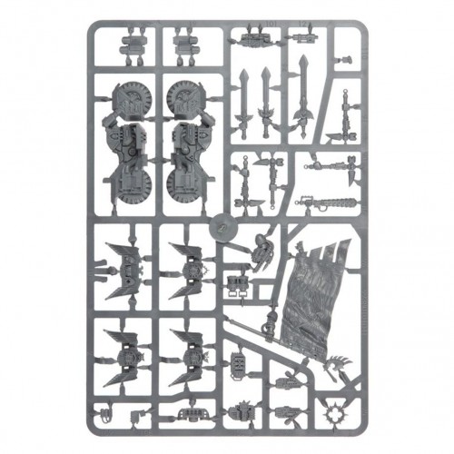 This kit is comprised of 122 plastic components with which to make a unit of three Ravenwing Black Knights. It is also supplied with a Dark Angels Transfer Sheet, and 3x Citadel 75mm x 41.5mm Oval Bases.