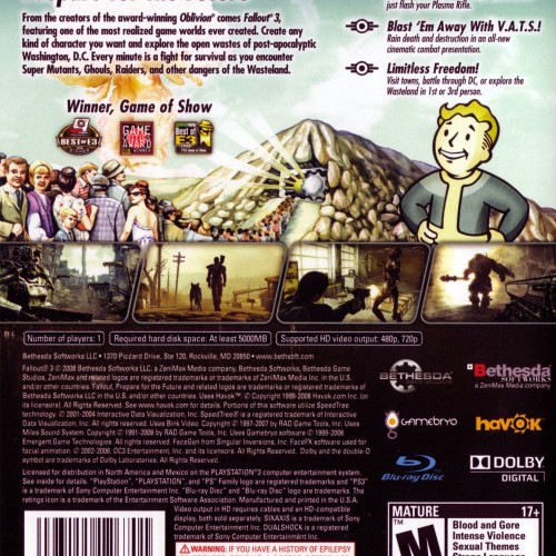 Emerge from Vault 101 and explore the desolate, post-apocalyptic wasteland of Washington D.C. in Fallout 3 for the Playstation 3. This acclaimed open-world action RPG allows you to create your own character, make impactful choices that shape the story, and battle mutated creatures and hostile survivors. Utilize the V.A.T.S. targeting system for strategic combat and scavenge for supplies to survive in a harsh new world. Your adventure in the Capital Wasteland begins now.