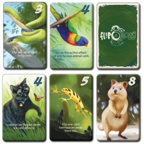 In??Flipology- players try to score the most points over three rounds. At the start of the game- each player receives nine cards- then picks seven of them to arrange in a face-down row. On your turn- you must flip one of your seven cards (up or down)- with some cards having effects that enable you to flip additional cards- including those owned by opponents. Cards depict animals in different types of environments- and they have different effects and point values depending on whats shown at rounds end- such as the sloth which is worth positive points only if its still face down. Aside from sloths and koalas- though- cards must end the game face up to contribute to a players score.