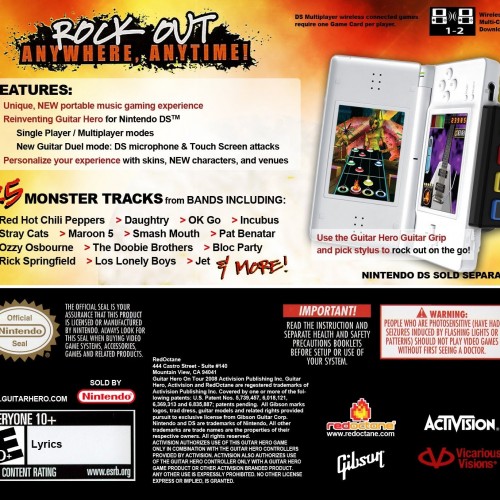 Shred on the go with Guitar Hero: On Tour for the Nintendo DS. This innovative title brings the rock star experience to your handheld, utilizing the unique Guitar Grip peripheral (sold separately) that attaches to your DS. Tap and strum your way through a setlist of rock anthems, from classic hits to modern favorites. Challenge friends in multiplayer duels or embark on a solo career. It’s portable Guitar Hero action!