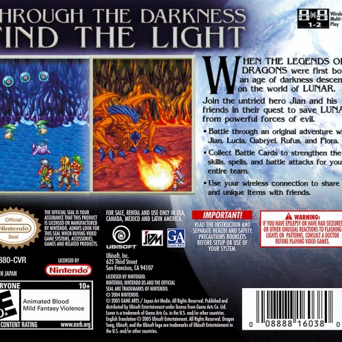 Go back to the origins of a legendary series with Lunar Dragon Song for the Nintendo DS. As the first original Lunar title for a handheld system, this RPG serves as a prequel to the classic Lunar: The Silver Star. You play as Jian, a courier who becomes entangled in a struggle between the Goddess Althena and the Vile Tribe. The game introduces a unique card-based battle system where you select commands from a deck, and features “Battle” and “Virtue” modes that determine whether you earn experience or items from combat. Navigate the world carefully, as running drains your health, adding a survival element to your quest to become the Dragonmaster.