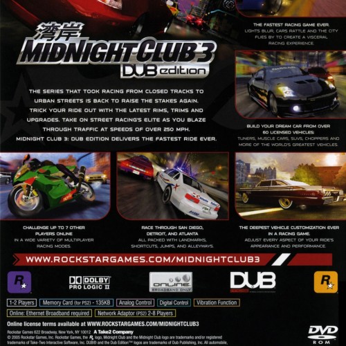 Own the streets in the definitive open-world racing experience, Midnight Club 3: DUB Edition for the Playstation 2. Race through stunningly detailed re-creations of San Diego, Atlanta, and Detroit, with no load times and no track barriers. This arcade racer offers an unprecedented level of vehicle customization, allowing you to modify everything from performance to appearance with top aftermarket brands. Choose from a massive roster of licensed cars, trucks, and motorcycles, and prove your skills in a variety of high-speed street races and tournaments.