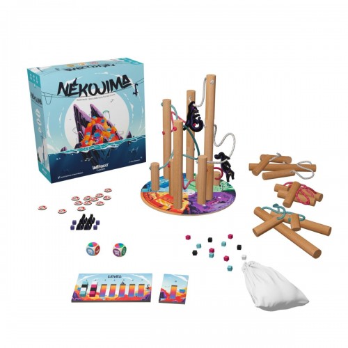 Nekojima is a wooden game of skill and dexterity in which you have to keep an entire installation in balance. Players take turns placing or stacking denchuu — 電柱, or electrical poles — respecting the locations without any hanging cables touching. Be careful not to be the one to bring down the structure. This game requires reflection, concentration and skill.
