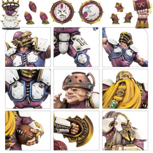 This multipart plastic kit builds an Old World Alliance team of 15 players for games of Blood Bowl. Using components from the existing Human, Dwarf, and Halfling team sets, you’ll be able to build 3 Halfling Hopefuls, 3 Human Linemen, 1 Human Blitzer, 1 Human Thrower, 1 Human Catcher, 3 Dwarf Blockers, 1 Dwarf Runner, 1 Dwarf Blitzer, and 1 Dwarf Troll Slayer. Some of these players include cosmetic options such as different heads to help you customise your own team. The box also includes six balls, two double-sided Blood Bowl coins, and two turn markers – split evenly between Dwarf and Human designs – and a sheet of Old World Alliance transfers with team logos, numbers, and positionals.