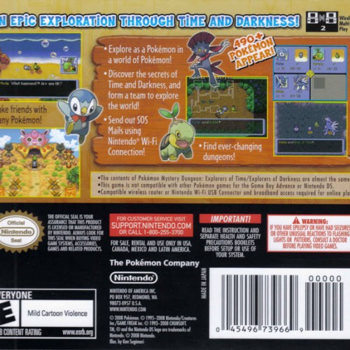 Experience a thrilling adventure as a Pokémon in Pokémon Mystery Dungeon: Explorers of Time for the Nintendo DS. After mysteriously transforming into a Pokémon, you join Wigglytuff’s Guild and team up with a partner to explore randomly generated dungeons. Battle hostile Pokémon in turn-based combat, recruit new allies, and undertake missions to discover valuable treasure and uncover the secrets behind the disruption of time. With its engaging storyline, deep strategic gameplay, and charming cast of characters, this RPG offers a unique and captivating Pokémon experience.
