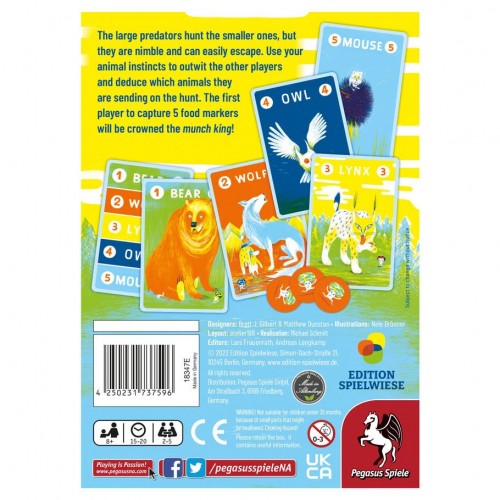 The large predators hunt the smaller ones, but they are nimble and can easily escape. Use your animal instincts to outwit the other players and deduce which animals they are sending on the hunt. The first player to capture 5 food markers will be crowned the munch king!