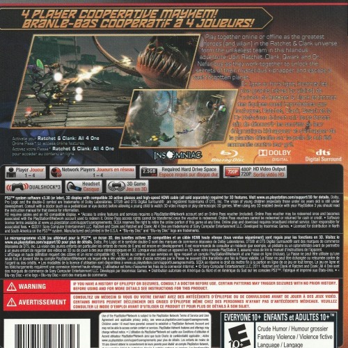 Team up for chaotic cooperative fun in Ratchet & Clank: All 4 One for the Playstation 3. When Ratchet, Clank, Captain Qwark, and Dr. Nefarious are captured by a mysterious new foe, they must reluctantly work together to escape and save the galaxy. This installment focuses on four-player cooperative gameplay, allowing friends to drop in and out as they solve environmental puzzles, battle massive enemies, and utilize unique character abilities. With its emphasis on teamwork and lighthearted humor, All 4 One offers a distinct and entertaining Ratchet & Clank experience.