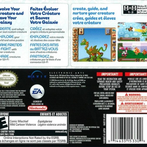 Evolve unique creatures and explore a vibrant ecosystem in Spore Creatures for the Nintendo DS. This unique life simulation and action-adventure game allows you to create and customize your own creature, then guide it through a charming alien world. Befriend other creatures by engaging in social interactions or battle them using collected body parts that grant different abilities. Complete quests, evolve your creature with new parts and powers, and uncover the secrets of the planet. Spore Creatures offers a creative and engaging portable experience focused on evolution and discovery.