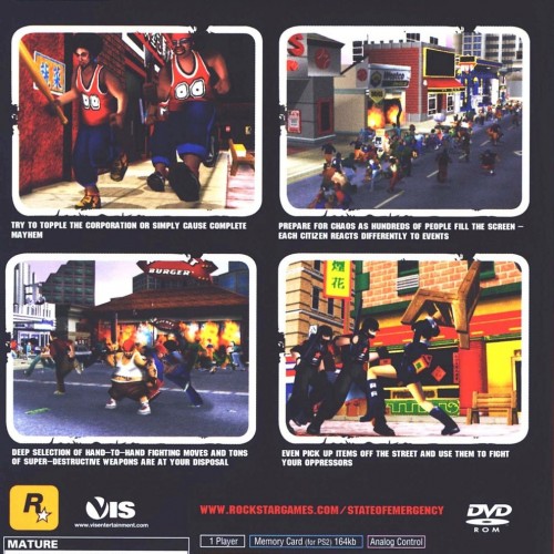 Inciting riots and battling for survival in a city under lockdown, you are thrust into the chaotic world of State of Emergency for the Playstation 2. As one of five unique characters, you must fight against the oppressive “Corporation” and complete various missions across sprawling, destructible urban environments. Engage in brutal melee combat and utilize improvised weaponry against hordes of enemies and rioting citizens. This controversial action title is known for its large-scale mayhem, over-the-top violence, and focus on creating widespread pandemonium in a fight for freedom against an authoritarian regime.