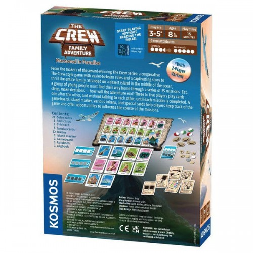 From the makers of the award-winning The Crew series: a cooperative The-Crew-style game with easier-to-learn rules and a captivating story to thrill the entire family. Stranded on a desert island in the middle of the ocean, a group of young people must find their way home through a series of 35 missions. Eat, sleep, make decisions — how will the adventure end? Three to five players play cards one after the other — and without talking to each other — until each mission is completed. A gameboard, island marker, various tokens, and special cards help players keep track of the game and offer opportunities to influence the course of the missions.