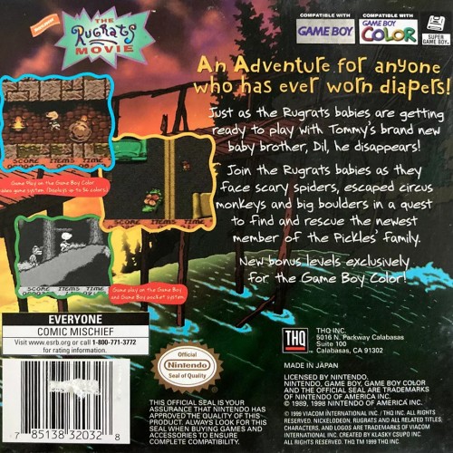 Join Tommy, Chuckie, and the gang for a new adventure in The Rugrats Movie for the GameBoy Color. Based on the hit animated film, this portable title allows you to play as the adventurous babies as they get lost in the woods and encounter various challenges. Navigate through colorful levels inspired by scenes from the movie, solve simple puzzles, and interact with familiar characters. With its accessible gameplay tailored for younger audiences and charming pixel art, The Rugrats Movie offers a fun and engaging handheld experience for fans of the beloved Nickelodeon toddlers.