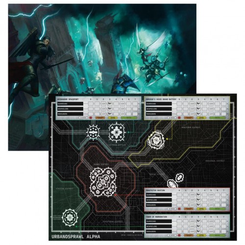 Included with the book are a set of photocopiable assets comprising two Crusade cards and an Order of Battle, as well as a double-sided A2 poster depicting the Urbanosprawl Alpha which can be used to track Campaign progress. The reverse side shows artwork of the Adepta Sororitas battling the Night Lords.