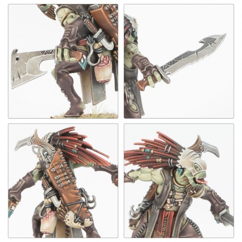 This multipart plastic kit builds a Kroot Flesh Shaper, a fearsome leader for the Kroot forces employed by the T’au Empire. The Flesh Shaper brandishes a pair of ritualistic butcher’s blades for carving up carefully-chosen prey, and keeps a Kroot scattergun slung over their back in a holster. They are draped in the grisly charms of their art, ranging from strung bones and spare blades to meat hooks and a Kroot skull.