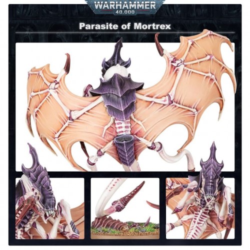 This kit bullds one Parasite of Mortrex. Armed with clawed limbs and a barbed ovipositor, this winged beast is a mobile incubation organism housing hundreds of Ripper pods. With a host of horrifying abilities, this unique biomorph adds disruptive tactical options to the already unpredictable tendrils of the Hive Fleet.